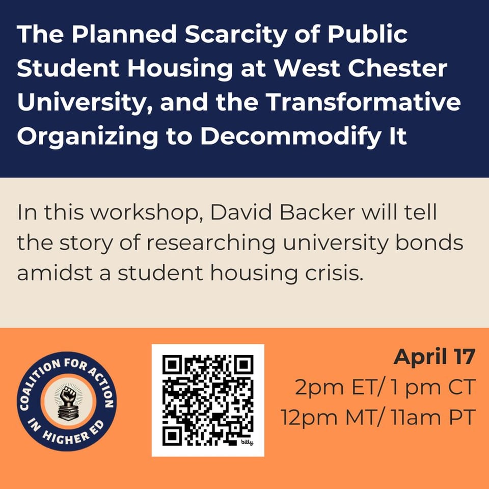 As I saw the successful action on university's main quad unfold Monday, I opened up the notes from my seminar and did a little more digging. Talking with some colleagues who are active in our faculty union and the Debt Collective, we wondered exactly how these dorms had been financed. We wanted to follow the money and maybe create a public record to support the students' demands. In contrast to the university's and media's framing of the issue as a natural outcome of increased student enrollment and supply/demand issues in campus housing, I found that the scarcity of affordable public dorms was actually part of the plan.