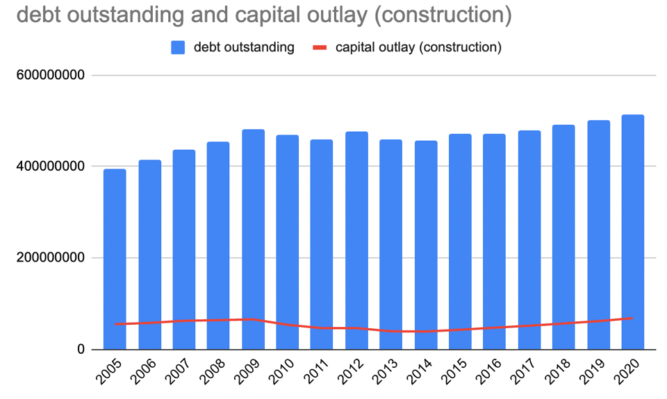 Here we have school district debt outstanding (blue) against capital outlay for construction (red) between 2005-2020: