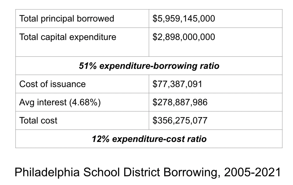 When taking into consideration the amount of money per dollar that it cost to get and use this money from the municipal bond market, namely interest and fees--which came to 12 cents for every dollar--what I'm finding is that lending two dollars only yielded 88 cents of actual capital expenditure in Philadelphia during this period.