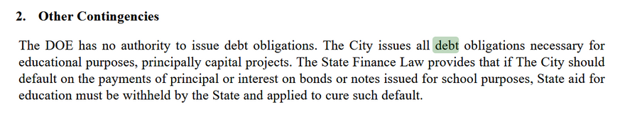 We also know from the DOE’s financial reports that it can’t issue it’s own debt. And if the city can’t pay its obligations, state aid goes to pay them off.