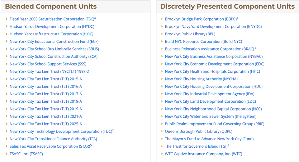 The Comptroller has reports for the School Construction Authority (how the city manages its school buildings), the Transitional Finance Authority (how the city borrows to finance its infrastructure needs, including school buildings), the Educational Construction Fund (a more marginal mixed-use bonding outlet that I’m interested in). But there’s a veritable swarm of component units through which the city borrows and repays its debts, too many to list, divided into “blended” and “discretely presented”: