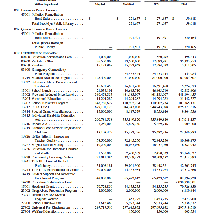 The School Construction Authority’s line (41905), is very wacky: the revenue in 2024 was $188 million and then decreases tenfold to $10 million 2025, with a modified budget amount of even less, at $68 million. What the hell? I know that the SCA is way behind on its targets for seat construction, but make this make sense!
