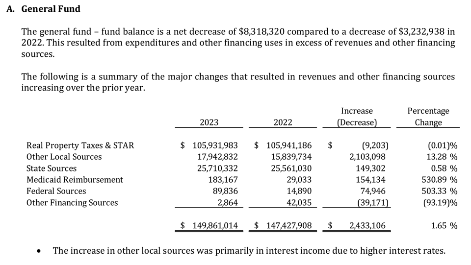 My second question is about that "interest earnings" concern they professed to have. I think this maybe refers to earnings the district gets on investments due to higher interest rates. But this is strange because there was actually a $2.1m increase in "other local sources" from increased interest rates. Yes, there was a roughly 40k decrease in "other financing sources" in that same period, but that's not that bad relative to the $8 million decrease in the general fund that the audited statements show above. What gives?