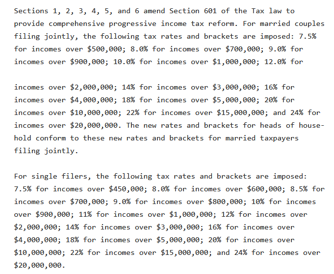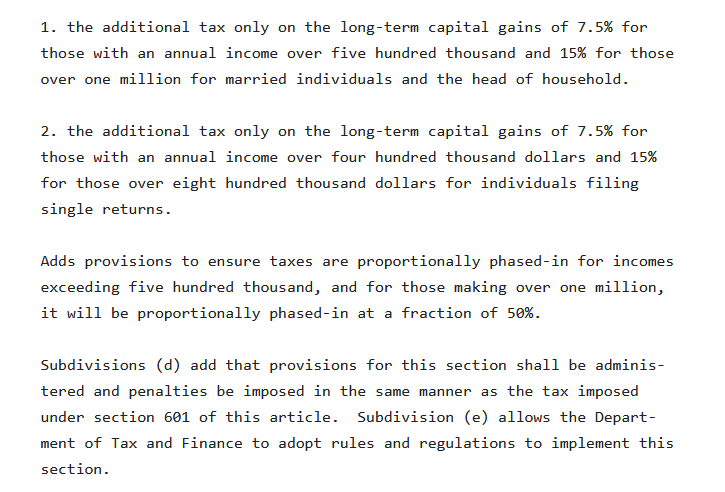 There’s a capital gains tax proposal too, on investment income. It’s also a kind of Trumproofing. “The purpose of this legislation is to amend the New York tax law to introduce an additional tax on investment income (capital gains), for the purposes of correcting the unfair federal tax benefit for income earned from investing rather than working.” Here are some things it does more precisely: