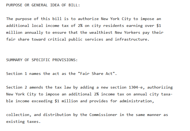 I’ve actually seen a secret fifth one recently, Liu and Souffrant’s “Fair Share Act,” described as the following by the Tax the Rich statewide coalition: “New York City charges essentially a flat income tax–if you earn $50,000 or $5 million, you pay practically the same tax rate of roughly 3.9%. By adding a 2% surcharge to those with incomes over $1m per year we can raise $4 billion.