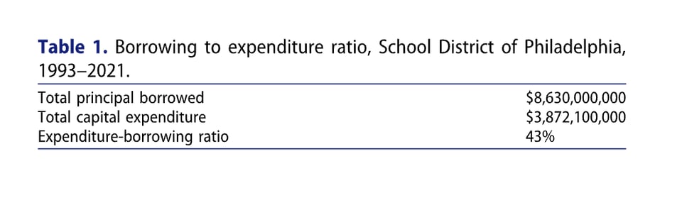 Then we compare bond principal lent to the district and the district's capital expenditures over a 28 period, we find that for every dollar that came in from the municipal bond market, the district was only able to spend 43 cents on its buildings.