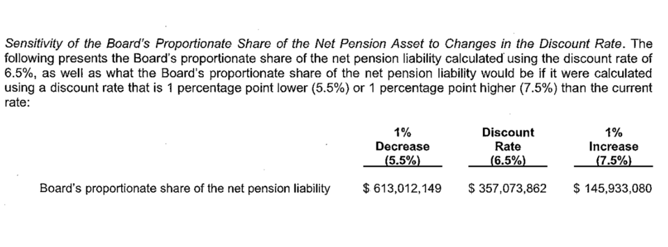 In every CAFR, and when I say CAFR, I mean certified audited financial report, there's a little section called “the Sensitivity of the Board's Proportionate Share to the Net Pension Asset to changes in the discount rate.” The discount rate is the time value of money. There's a new book called Discounting the Future, which is one of the best books I read last year. It really blew my mind. If you want to understand what financialization is, both materially and historically, this book is about financialization as a way of thinking about what we value in terms of what it's going to be worth in the future, and how we then think about that now—net present value.