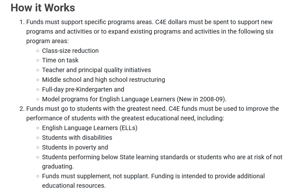 The NYC Department of Education receives some of its annual budget from the NY State Foundation Aid program. Every year, the State allows some of the additional aid to be used for growth in general operating costs and investment in ongoing programs. However, some of the funding must be used according to the State’s “Contracts for Excellence” law. New York City schools received Contracts for Excellence (C4E) funds for the first time in the 2007–2008 school year. These funds under State law must be given to certain schools and must be spent by those schools in specific program areas.