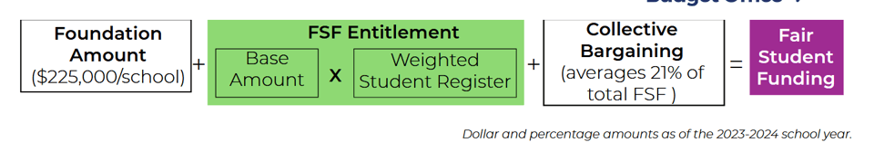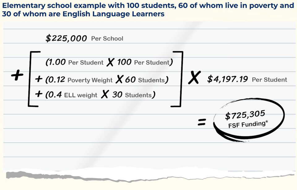 • a fixed foundation amount of $225,000 per school, regardless of size, meant to cover core administrative staff