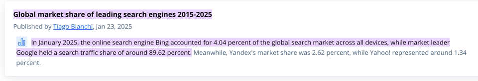Much is made of Google’s share dropping below 90% in 2025, but 89.62% is still almost total search dominance. AI search is a small part of the market and a small, although significant, part of Google’s SERPs.