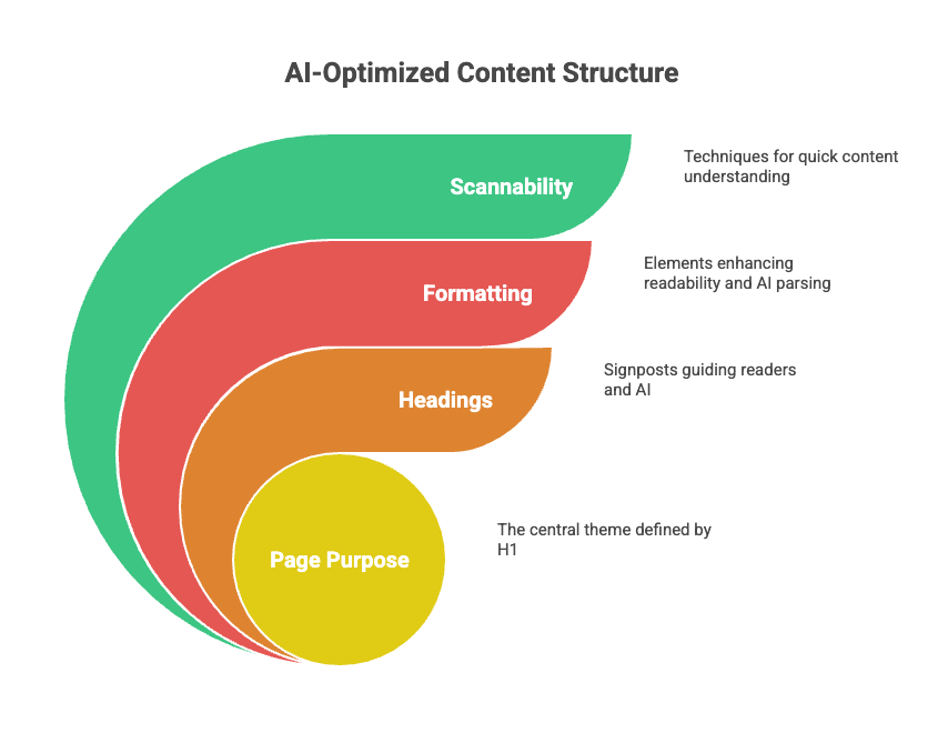 Content structure isn't just about making your pages look organised. It's about helping AI systems parse, summarise, and extract the information that matters most. Well-structured content signals expertise and creates the logical flow that both humans and AI systems need.
