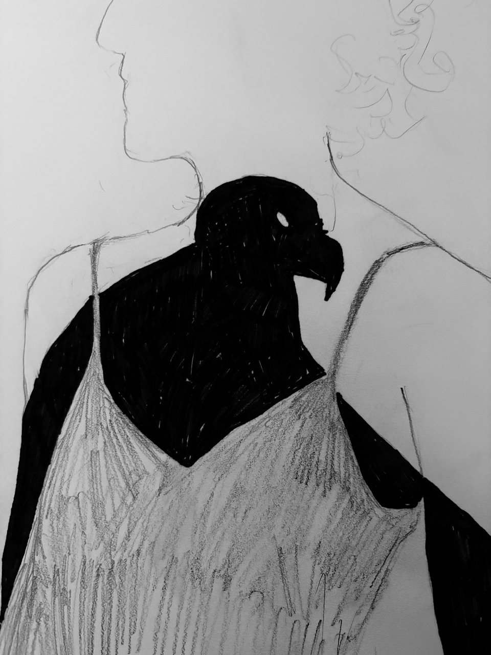 The vulture lifted its wings out of Samah’s back, twin inky shadows rising on either side of her shoulders before its long neck stretched to look up. It shook its head, opened its beak to let out a silent cry, and then sank back down into Samah’s skin. It was not ready to leave.