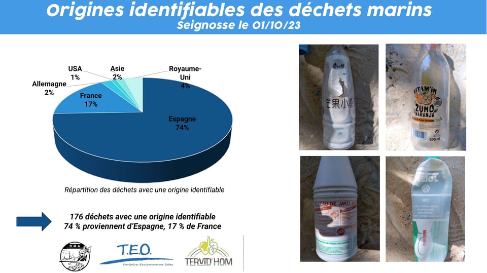 L'après midi fut consacrée au tri des 368,5 kg et 3368 litres de déchets, dominés à 90% en poids et à 92% en volume par le plastique. Sur les 176 inscriptions lisibles, 74% étaient espagnoles, 17% françaises et 2% asiatiques. L'origine marine des déchets ne fait donc plus de doute.