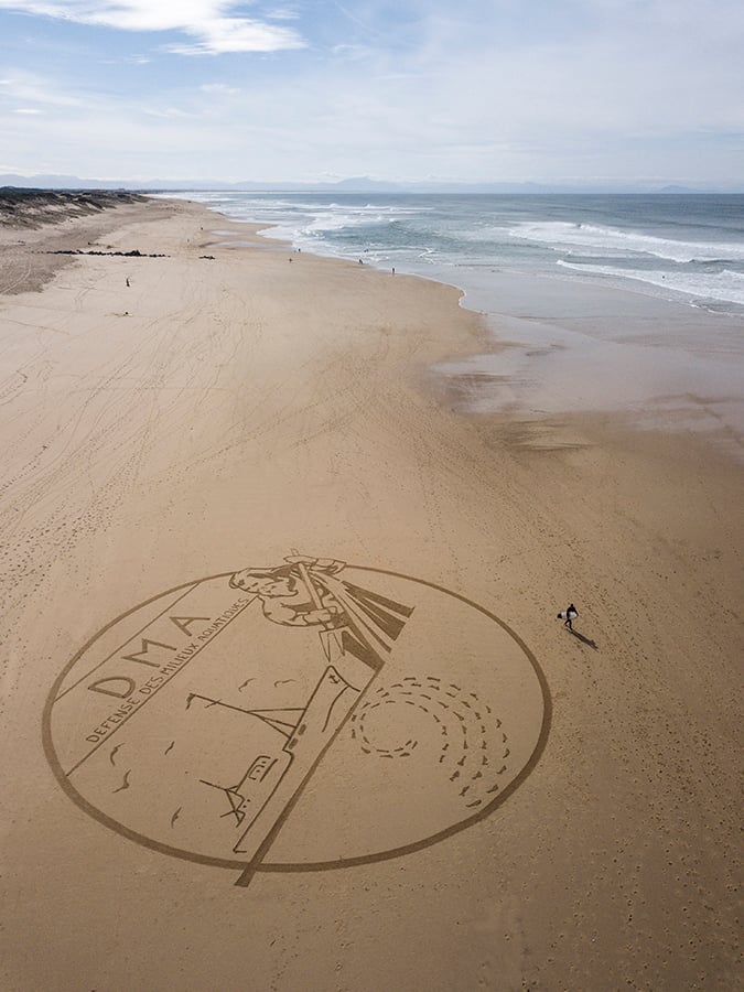 Quelques heures ont suffi à Samuel DOUGADOS pour dessiner sur le sable landais à marée basse le logo de l'Association. En s'élevant en altitude, le drone révèle comme par magie le visage de Poséidon et toute la détermination de l'Association!