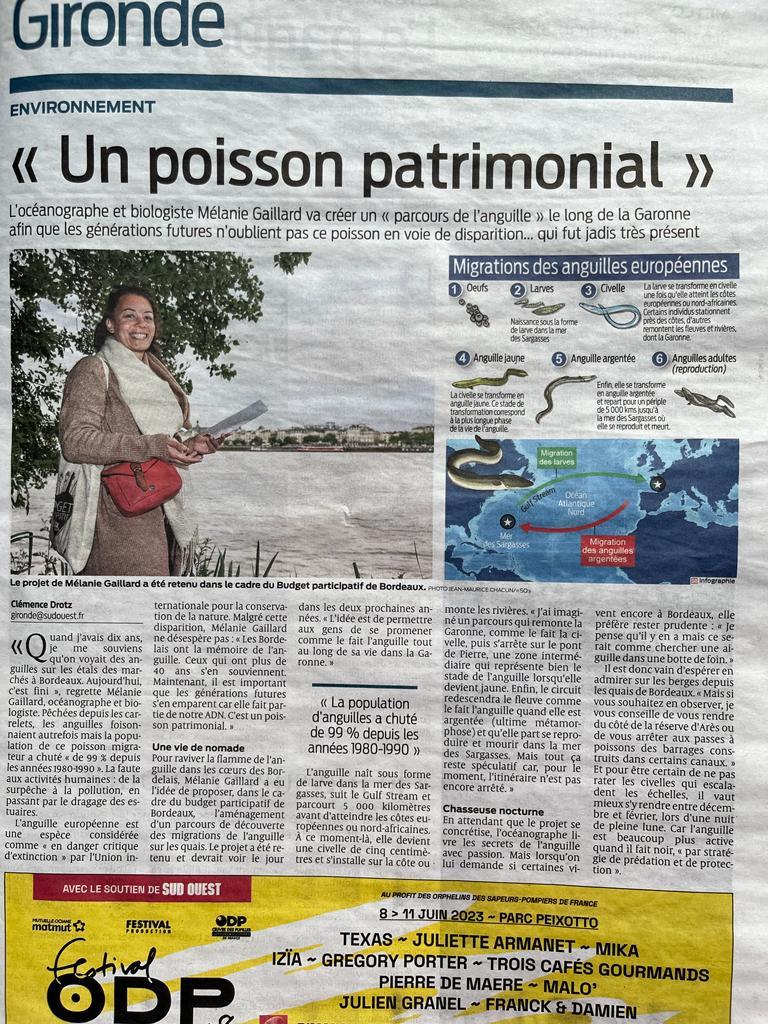 Connaître c'est aimer et protéger. Mélanie GAILLARD, scientifique de l'Institut national de recherche pour l'agriculture, l'alimentation et l'environnement (INRAE) s'est inspirée de cet adage pour faire accepter son projet de création d'un parcours de vie de l'anguille le long des quais de la Garonne à Bordeaux. Plus que jamais le public doit prendre conscience de la situation désespérée de l'anguille officiellement en danger critique d'extinction depuis 2008 et dont les populations ne se restaurent pas en dépit d'un plan européen en sa faveur de plus en plus décrié pour son inefficacité. L'idée de Mélanie est lumineuse puisqu'elle contribuera à alerter l'opinion publique, la seule force capable de faire entendre raison à des politiques publiques pour l'instant contradictoires sur le sujet.