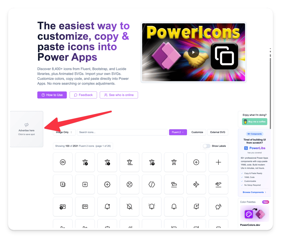 I've added a left sidebar on PowerIcons specifically for ad cards from other companies or developers who want to reach this niche audience. If you're curious about the traffic, there's a "See who's online" button in the hero section that takes you to my live analytics page.