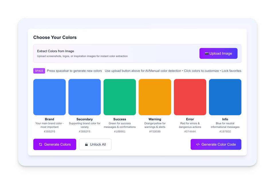The algorithm behind it ensures colors work well together. If you have a dark blue brand color, you won't get a random light green secondary. Success colors lean green, warnings stay in the orange zone, errors stay red. It just makes sense.