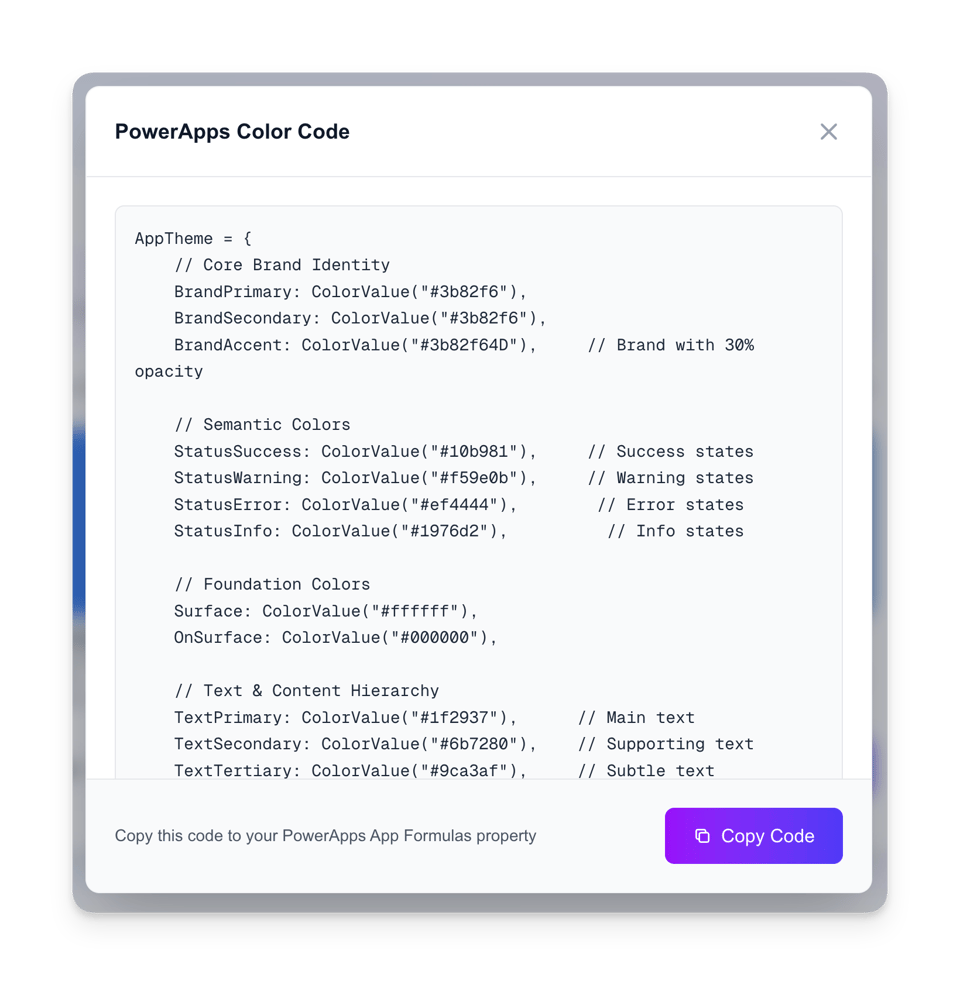 When you're happy with your palette, click "Generate Color Code." You get perfectly formatted code for your Formulas property in PowerApps. It creates an app theme with everything you need: brand colors, status colors, text colors, border colors, background colors.