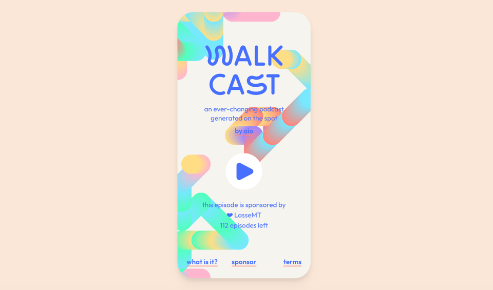 Infinite podcast, continuously generated by AI as you walk. Based on where you are, it generates a story about the streets, landmarks and history, sometimes making stuff up, creating a unique and unplanned experience.