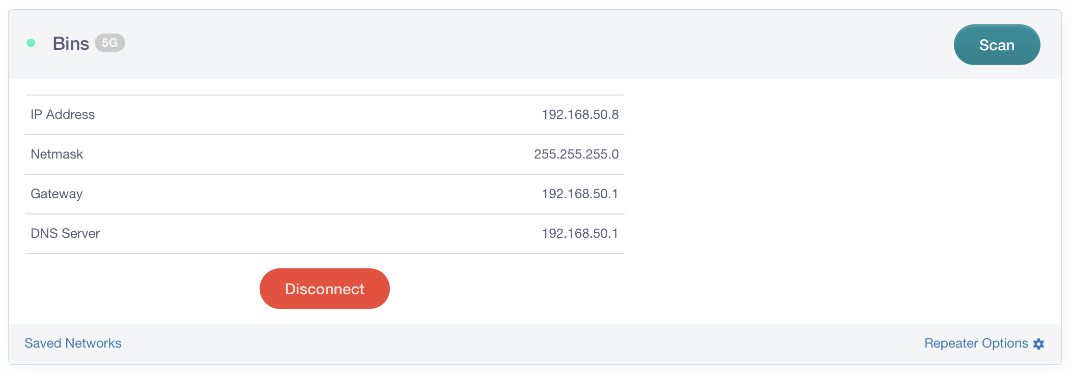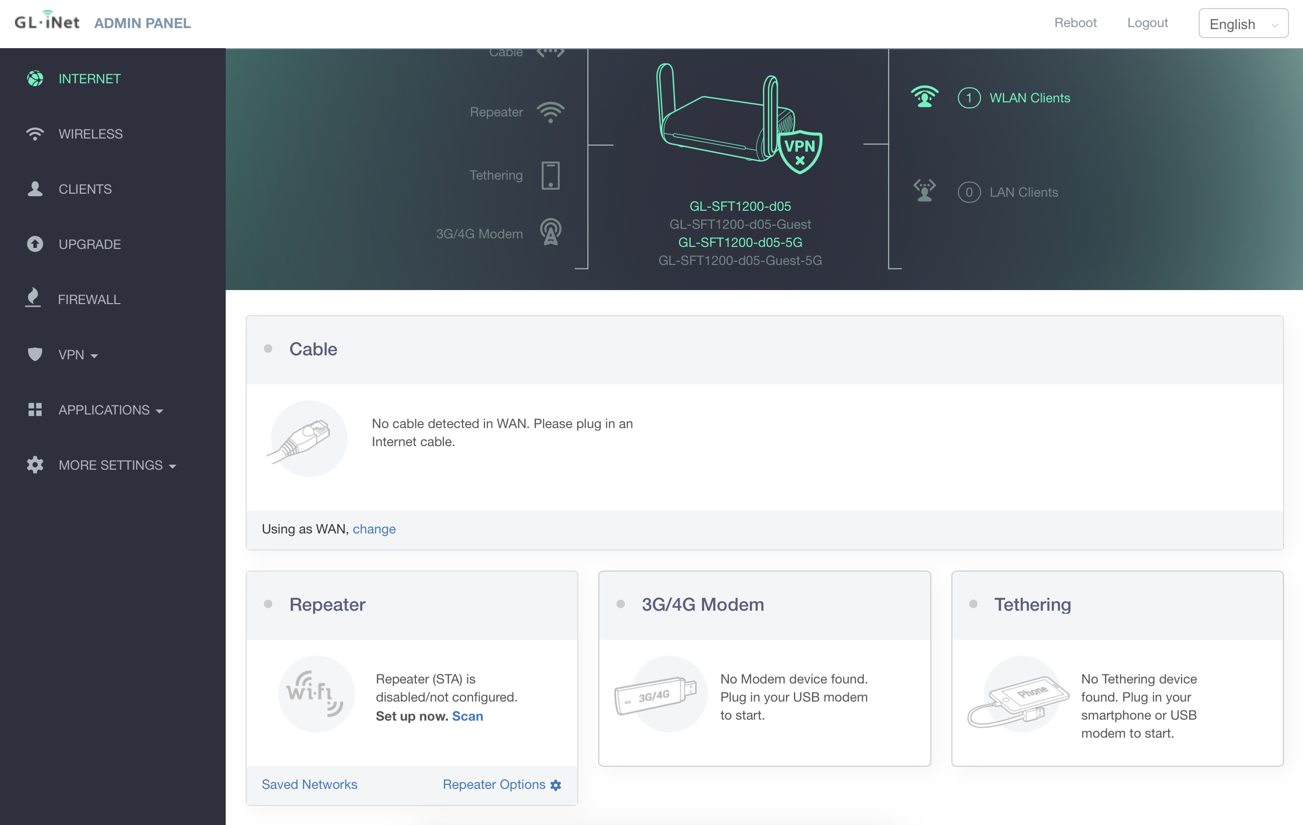 Now you’ve reached the admin portal. The goal is to make the GL.iNet extend (or repeat) an existing WiFi network. Click “Scan” in the Repeater area to set this up.
