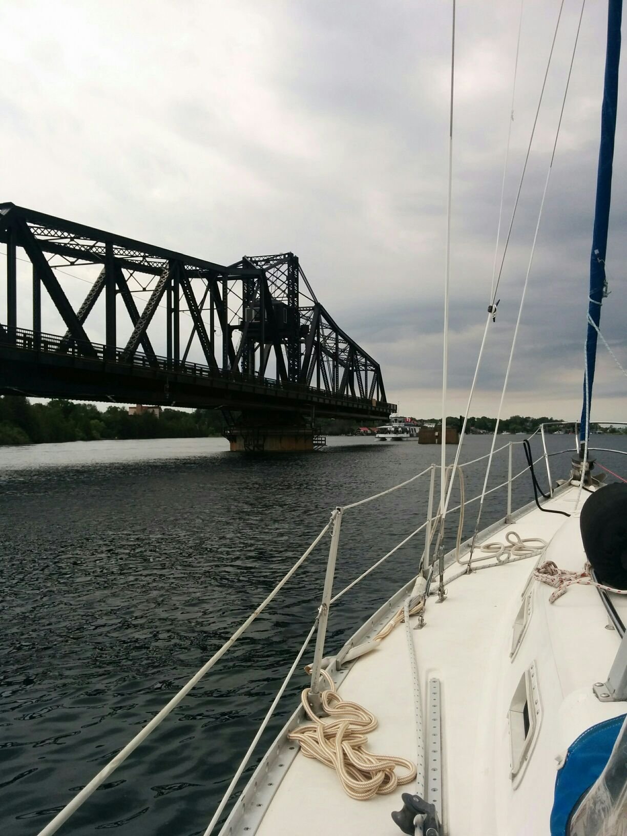 Today's destination is Little Current on Manitoulin Island where we will tie up at a dock for the first time since leaving Parry Sound. First we have to pass through a swing bridge that is too low for most boats to go under, and closed 45 minutes of each hour. On the hour it swings open by swiveling on its centre so that the road bed is now suspended along the middle of the channel, aligned parallel to both shores, and boats can now pass through on either side of it. As it takes time to swing open and shut there's only 5 minutes for boat traffic so you need to time your arrival carefully! We were glad there was only us going through at 2pm as we had to do a few circles while waiting.