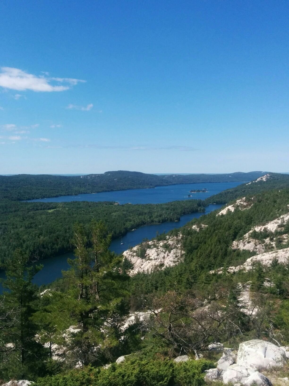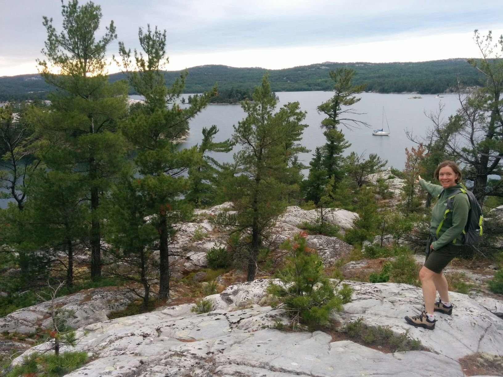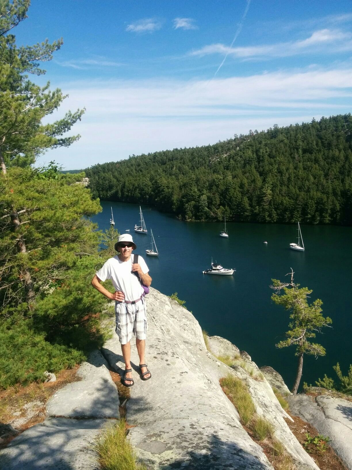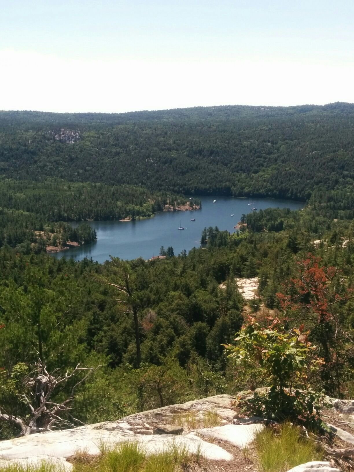 Day 10: To Killarney and overnight in Covered Portage Cove. The scenery is spectacular with the La Cloche hills of quartzite gleaming white in the sun. The tiny town of Killarney was fun to go through. We didn't stop this time but might on the way back. There is a long straight and narrow channel between the town and George Island just off shore, which you motor through dead slow, and admire the docks, cottages, marinas, church, liquor store (30 minute free docking for customers only), fish and chip shop, resort hotel, kayakers, canoes, power boats etc. It was a sunny Sunday and there was a lot of activity. We continued on to Covered Portage Cove which is an amazing anchorage. There's a striking rock face just at the entrance which we ended up anchoring near. The cove is tiny and surrounded by pine-covered hills and rock cliffs. There were about 10 or so boats here. We braved the mosquitoes and hiked up for a view.