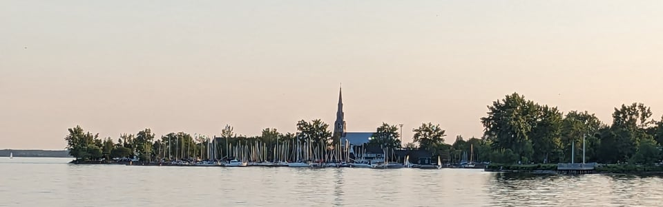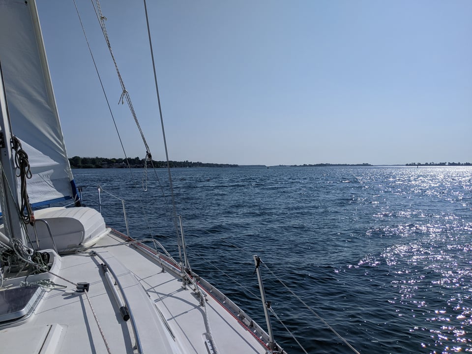 We sailed all day today and it was lovely. We tacked repeatedly up Lac St Francois. It is a shallow lake with a deep marked channel for the seaway vessels and our Navionics track shows a pretty yellow zigzag all the way up this channel. (Navionics is the navigation software we use on the tablet.) We saw a metal-roofed church on the shore at Saint Anicet, silver and glinting in the sun from afar. There were other boats out for day sails, very cheerful.
