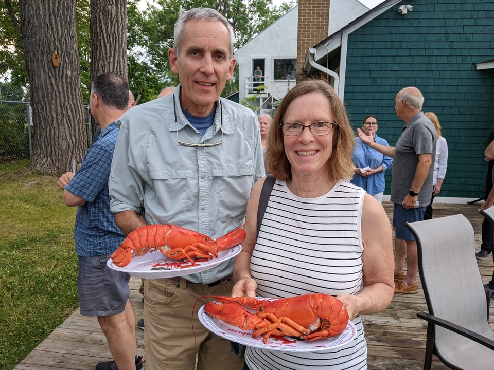 We managed to get a seat for the sold-out annual lobster dinner at the yacht club, and I got to experience my first whole lobster. There was an option to have it partially cracked and shelled (which I took) or you could just take it whole (Andy's choice, as the lineup was shorter). Dessert was strawberries and cream, yum.