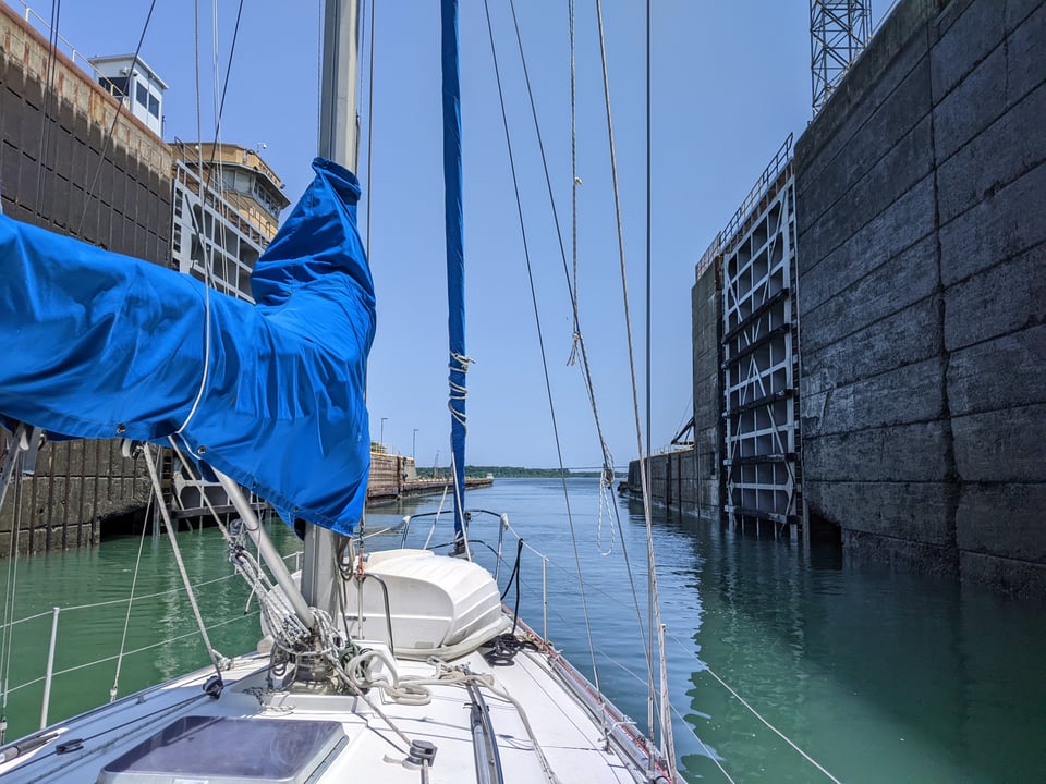 To get downriver past Montreal we will go through a total of 6 locks. Today was the first, the Iroquois lock. We'd booked and paid online the night before, but the transit time is not published until 7:30am. The earliest time is 9:30, and you're supposed to arrive an hour ahead, so we had to be ready to go at 8am just in case. In the end our time turned out to be 11am so we went back to our tea and reading for a while. There were two other sailboats in the anchorage and everyone came to life at the same time and motored over to the pleasure craft waiting dock at the lock for 10am.