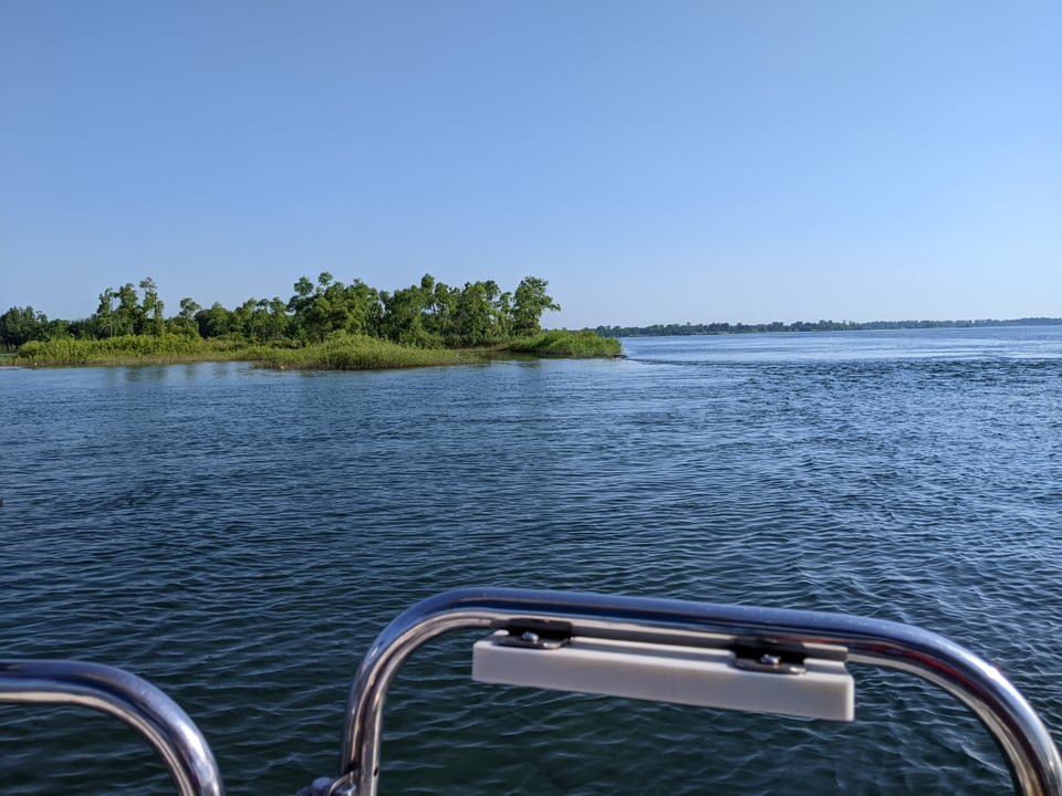 We anchored off Morrison Island, in the Long Sault chain of islands that were partly created during the flooding and construction of the seaway in the 1950s. The anchorage seemed secure at the time (!) and we had a pleasant evening including a row around the bay.