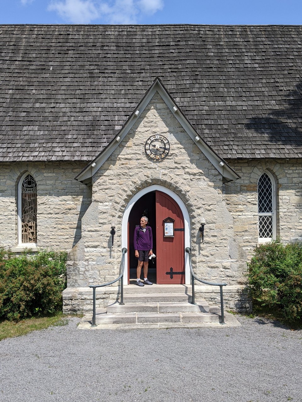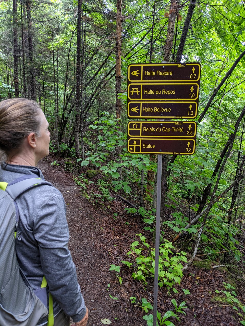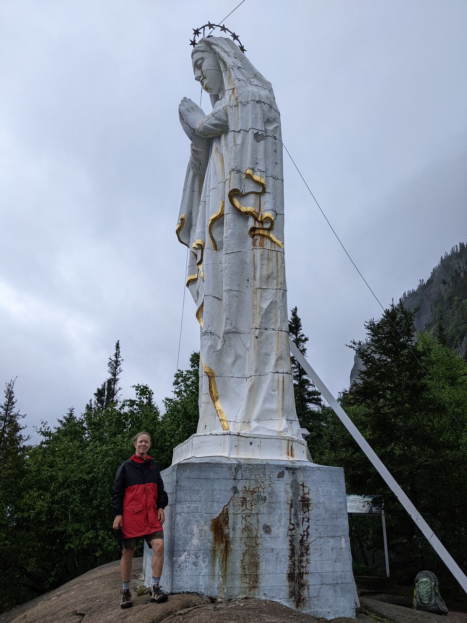 Today we hiked up along Cap Trinité for great views back down the bay, and eventually reached the religious statue Notre Dame du Saguenay that watches over sailors from her perch on the lower bump of the 3-bumped Cap Trinité. She was erected in the 1880s by a merchant in thanks for surviving his fall through the ice while transporting goods in winter. She looks a bit worn out up close, but shines like a white beacon when viewed from the water level.