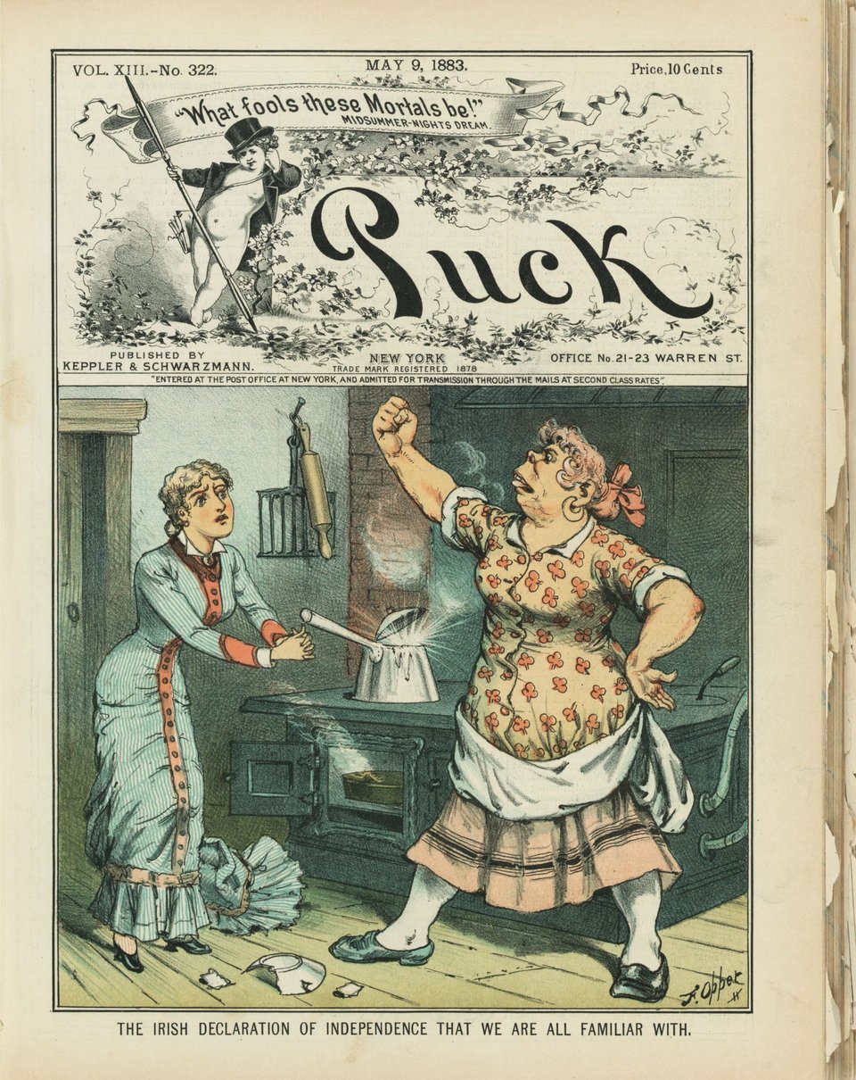 There’s a lot to unpack here, but one of the things that jumped out at me, looking at this racist-as-hell cartoon, was the sheer familiarity of what I was looking at. The Irish servant is the very picture of a too-masculine woman: ape-like face, so thick that Gaston is taking notes, brutish and uncontrolled—a violation, of course, of everything a woman (and therefore a human being) is supposed to be.