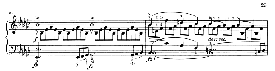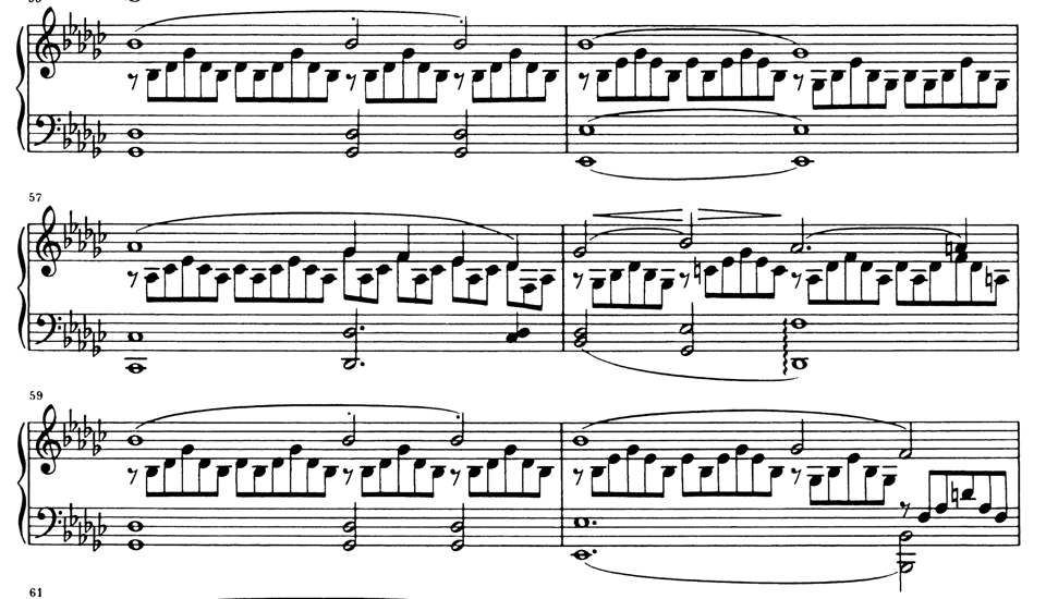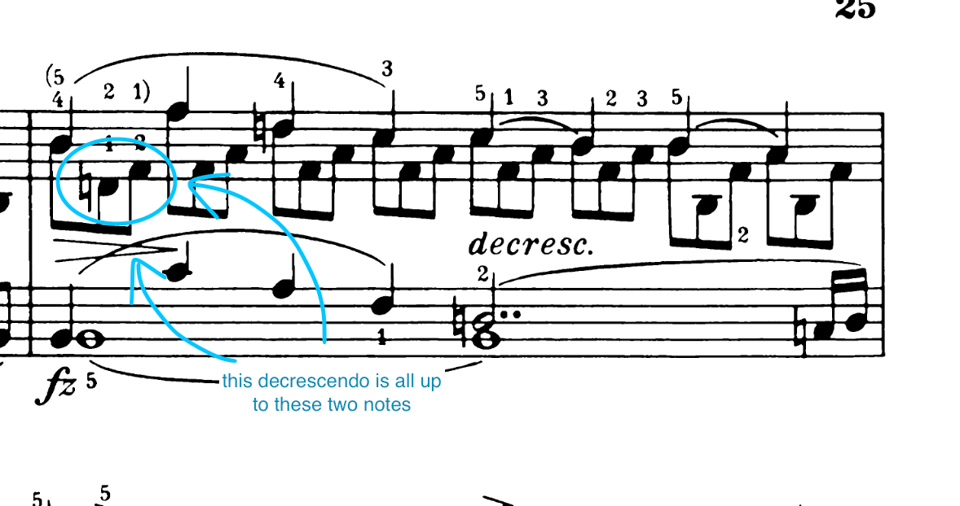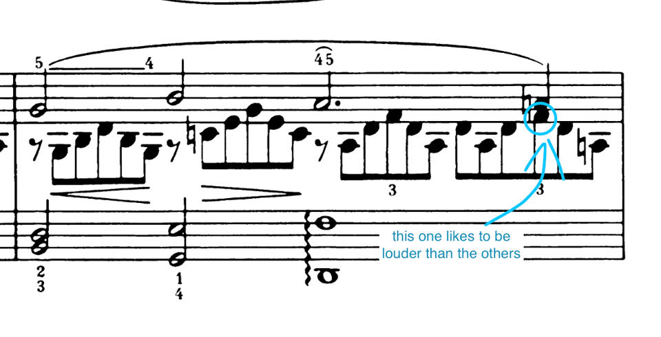 Throughout the Impromptu, the inner notes quietly ripple under the melody, and thus have to be a lot softer—any yokel could tell you that, but my teacher demanded far more than just “little notes quiet, big notes loud.” To start with, every single inner note still had to be clearly heard—it’s all too easy to drop or swallow a quiet note and not notice, but my teacher could pinpoint when a seemingly unimportant note didn’t sound with perfect clarity.