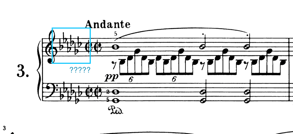 Then it hit me—the many-flatted key is a clue. This piece could have easily been in G Major instead of G-flat—one sharp instead of six flats, and indeed there are published versions of this work in G Major—but G Major has a certain brightness and immediacy that doesn’t quite gel with what’s going on in the Impromptu. Shifting the whole thing down a half step, away from the orange-juice-sunniness of G Major, washes the piece with a sepia tone, imbuing it with a sense of memory.