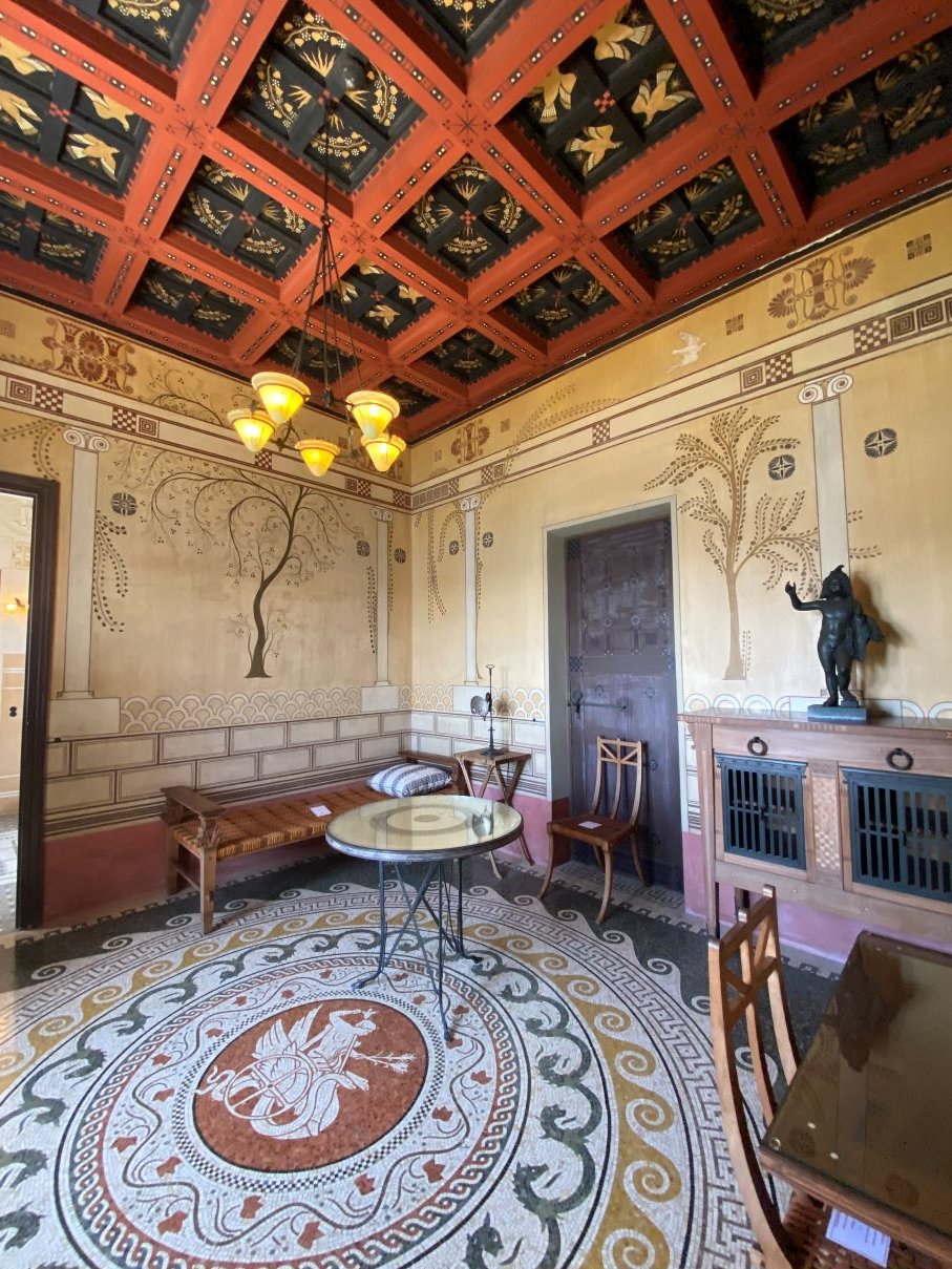 place: Villa Kérylos by Emmanuel Pontremoli (1908). Unlike E-1027 I didn’t know anything about this house before arriving, but I immediately fell in love. Built in 1902-1908 for archeologist Théodore Reinach, the Villa Kérylos was intended to be a modern take on an ancient Greek villa, complete with furniture based on ancient Greek forms. The most magical aspect, to me, was the interior decor. Every floor was mosaiced, every wall painted and ceiling painted or with plaster bas-relief carvings. A visual delight.