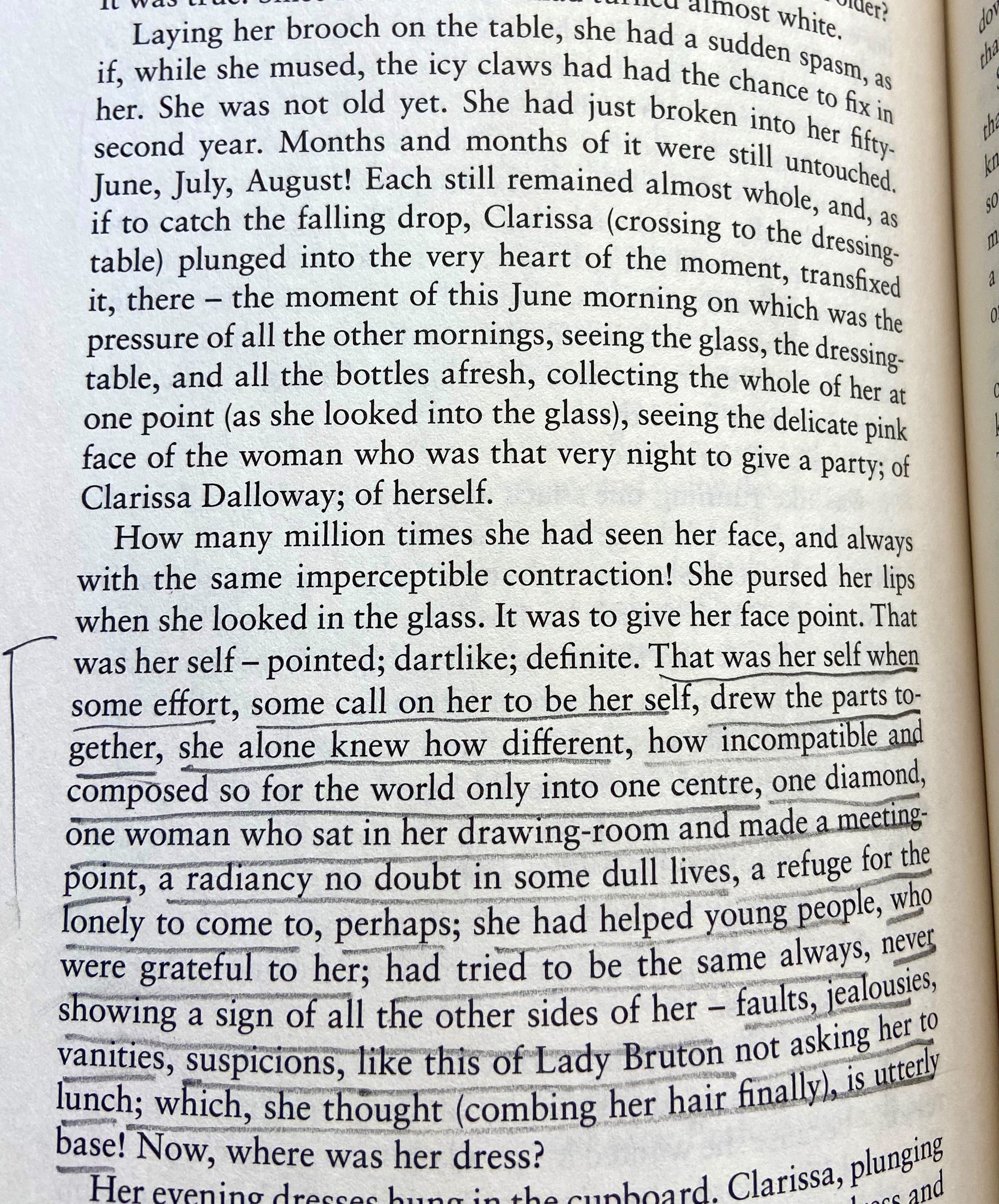 Clarissa Dalloway, like most of us at some point, wonders how so much time has passed while resisting the urge to see herself as old, assuring herself that she has so much time left in her life, “months and months of it were still untouched.” She looks at her face in the mirror, as has done “how many millions of times,” and Woolf shows us selfhood at work: Clarissa sees herself as others see her (“pointed; dartlike; definite”), or rather she sees the self others see when “some effort, some call on her to be her self, drew the parts together”. But she also sees how that self is a construction, Selves are baggy, disparate, made up of different and “incompatible” parts, composed to present to others as “one center, one diamond.” And the world cuts back through the thinking (“Now, where was her dress?”). It’s important to note that Clarissa is not mentally flawed or unique; she is all of us.