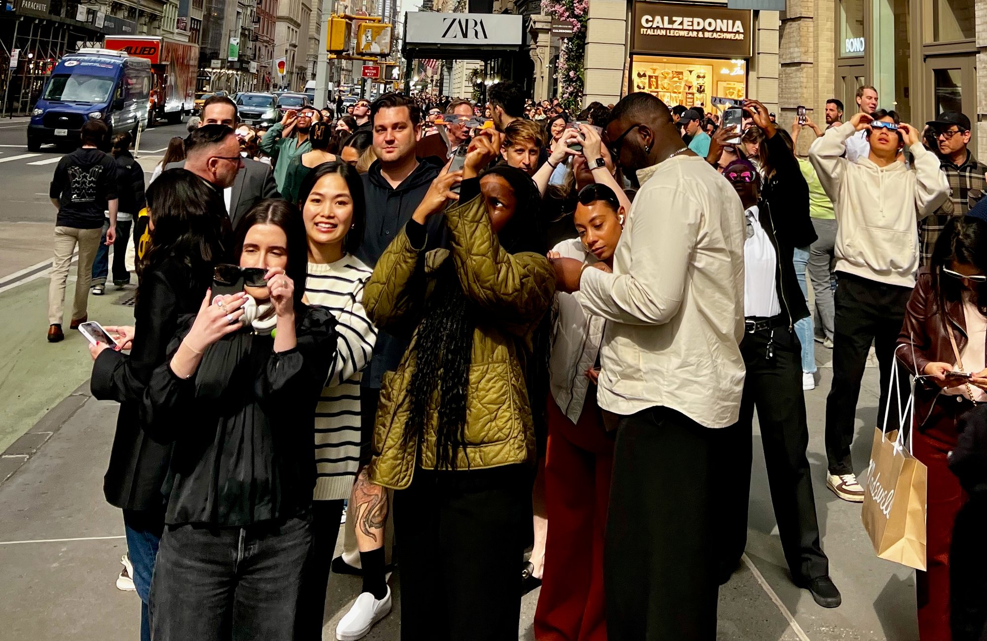 Since I couldn’t look at the sun, I decided to look at everything else. Traffic on the long-legged avenue near us had slowed somewhat, though the food-delivery workers continued zipping down their lane on electric bikes. Rooftops across the neighborhood were full of people watching the eclipse, clustering on fire escapes, crowding on the sidewalks sharing pairs of cardboard glasses. Everyone turned, smiling, toward the same point in the sky.