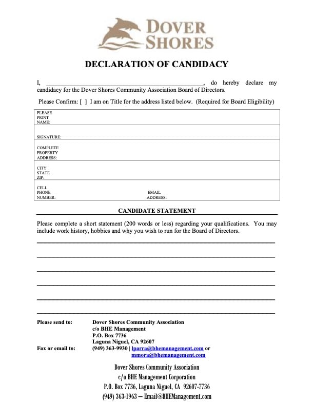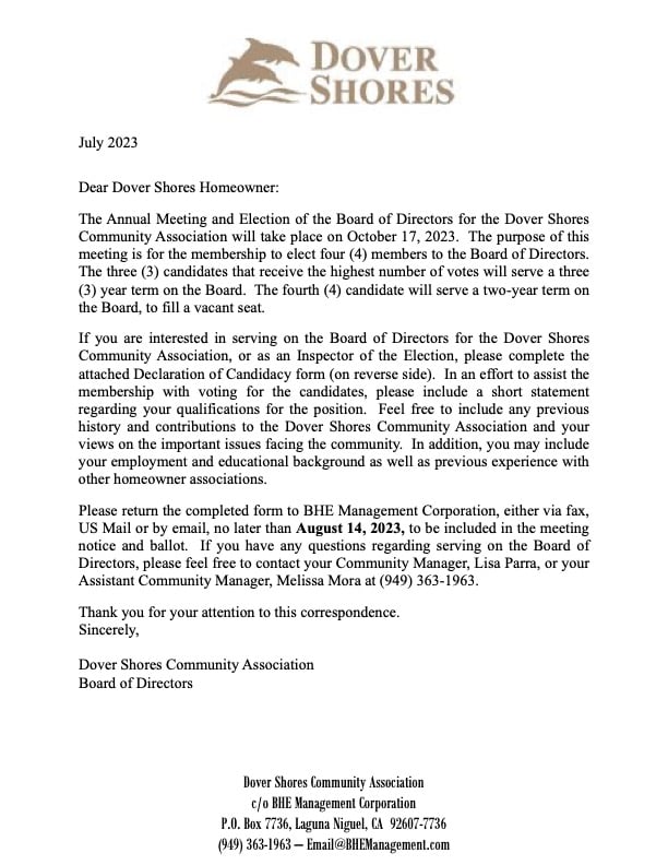 IF YOU WISH TO RUN FOR A SEAT ON YOUR DOVER SHORES HOA BOARD,THE DEADLINE FOR SUBMITTING CANDIDACY STATEMENTS IS AUGUST 14.