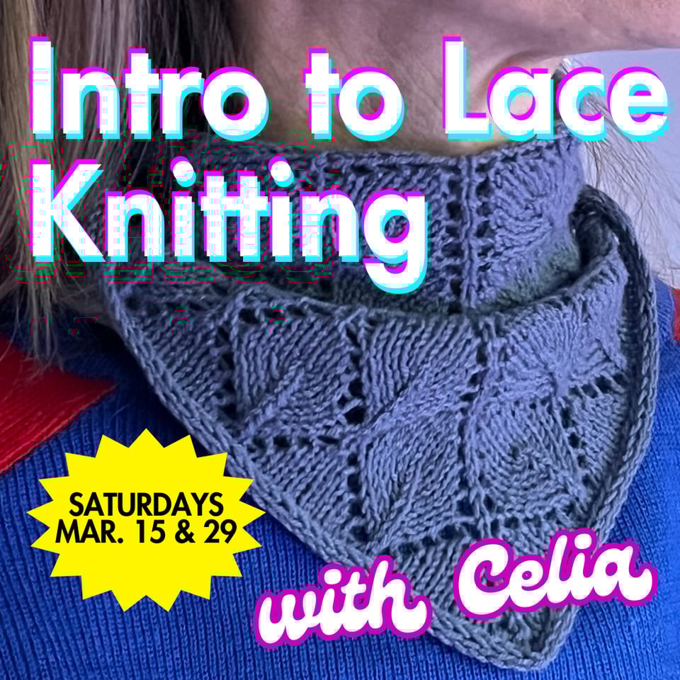 First off, I’d like to introduce Celia Garb as our newest teacher. If you’ve ever been curious about lacework but intimidated by the weird charts and fancy stitches, Celia’s put together a fabulous syllabus that will give you confidence to expand your crafting skill repertoire. The only requirement is knowledge of the basic knit and purl stitches. Sign up soon because this class will begin the weekend after next!