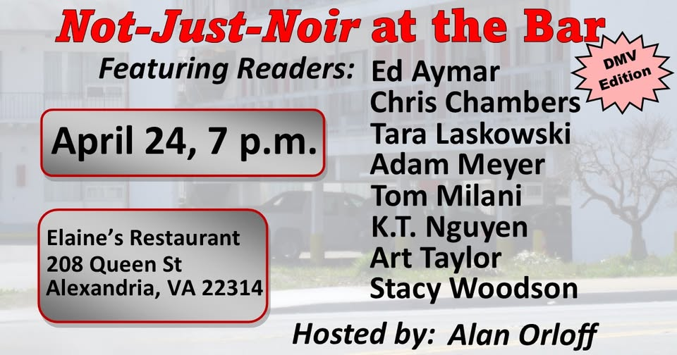 And then, on April 24, I’m reading at a Virginia Noir at the Bar at Elaine’s in Alexandria, hosted by Alan Orloff. I have something new I’m excited to read, and the lineup is crazy good. Check out the info below, and come out to hang and hear and eat.