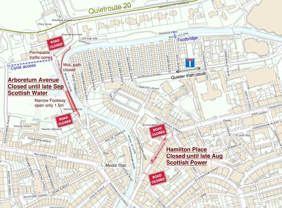 ⚡ Marchmont Road: Closed southbound between Marchmont Cres and Strathearn Rd for Scottish Power works until late September, affecting the old faint on-street cycle lanes. Greenbank – Meadows QuietRoute may offer an alternate route but be aware of works on Whitehouse Loan.