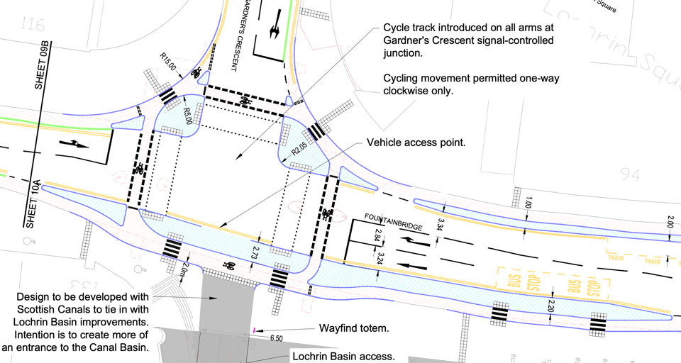👀 For the first time (that we’ve seen), there are a couple of brilliant ‘overview’ images that paint illustrations of the new infrastructure and interventions directly onto maps of the area. These are large image files that require zooming in to see the implementation, but are a little easier to parse than the technical drawings alone. The first image [13.3mb] lays out the Dundee St / Fountainbridge Route, while the second image [17.8mb] contains a number of the southern ‘canal alternative’ interventions being planned within the project that also ease school routes and the crossing of Ashley Terrace. These are well worth a look over, particularly if you find the usual technical PDFs difficult to visualise.