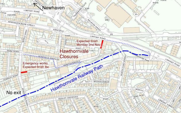 🍂 Hawthornvale: Closed at Lindsay Rd by the Sculpture workshop for Scottish Water repairs. If you’re travelling between to Newhaven and the Hawthornvale path, going to the end of the path may avoid a dismount. Update 2nd Nov: Works delayed, and new emergency works at Newhaven Rd.