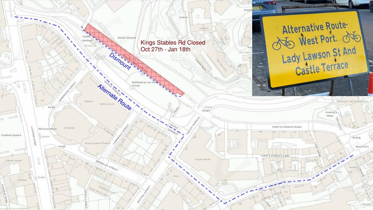 🚛 Kings Stables Rd: Closure between Lothian Rd and the Barrace Steps for Christmas market setup from today (Monday 27th October) until 18th January. It should be possible to dismount for 200m, or West Port and Castle Ter may offer an alternate route.