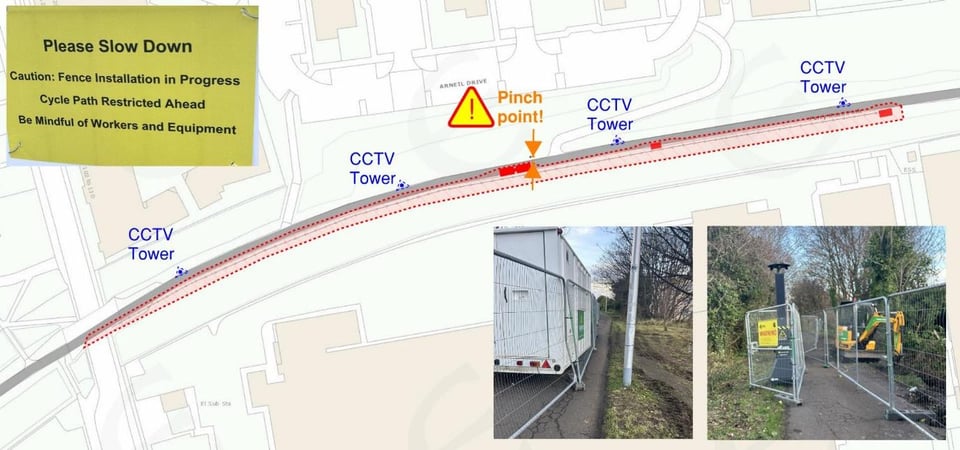 🏞️⚠️ Ferry Road Path: Obstructions of offroad path between Leonardo and Morrisons by works to extend the security fence. The path was reopened during the works, following intervention from local councillors and Spokes, but unfortunately construction kit was not moved out of the way. Exercise caution at pinch points 80cm wide.
