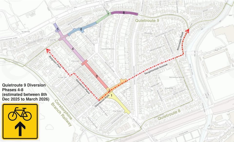 🚧 Saughton Crescent: Sections of QuietRoute 9 closed for resurfacing and Active Travel improvements by Balgreen from 20th October into 2026. Impact on cycling expected in phases 4-8, for which a signed cycle diversion is to be provided.
