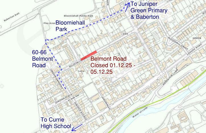 🏫 Belmont Rd: Side road between Juniper Green Primary and Currie High School closed for emergency BT repairs from today 1st December until Friday 5th December. If works prevent cycle access, Bloomiehall Park may be an alternative.
