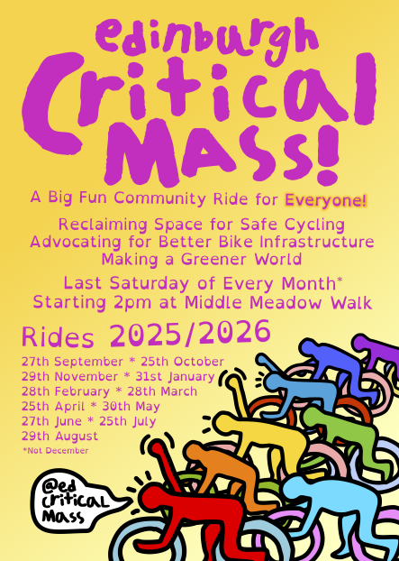 ✊ No ride in December - see you Jan 31st! Last Saturday of the month: Critical Mass Edinburgh, Family-friendly mass protest / group ride, 2pm, Middle Meadow Walk;