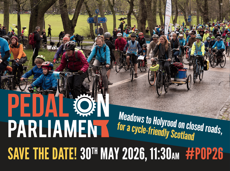 Pedal on Parliament is back for 2026, with a mass ride of cyclists of all ages and abilities from Middle Meadow Walk to the Scottish Parliament at Holyrood, 11:30am on May 30th.