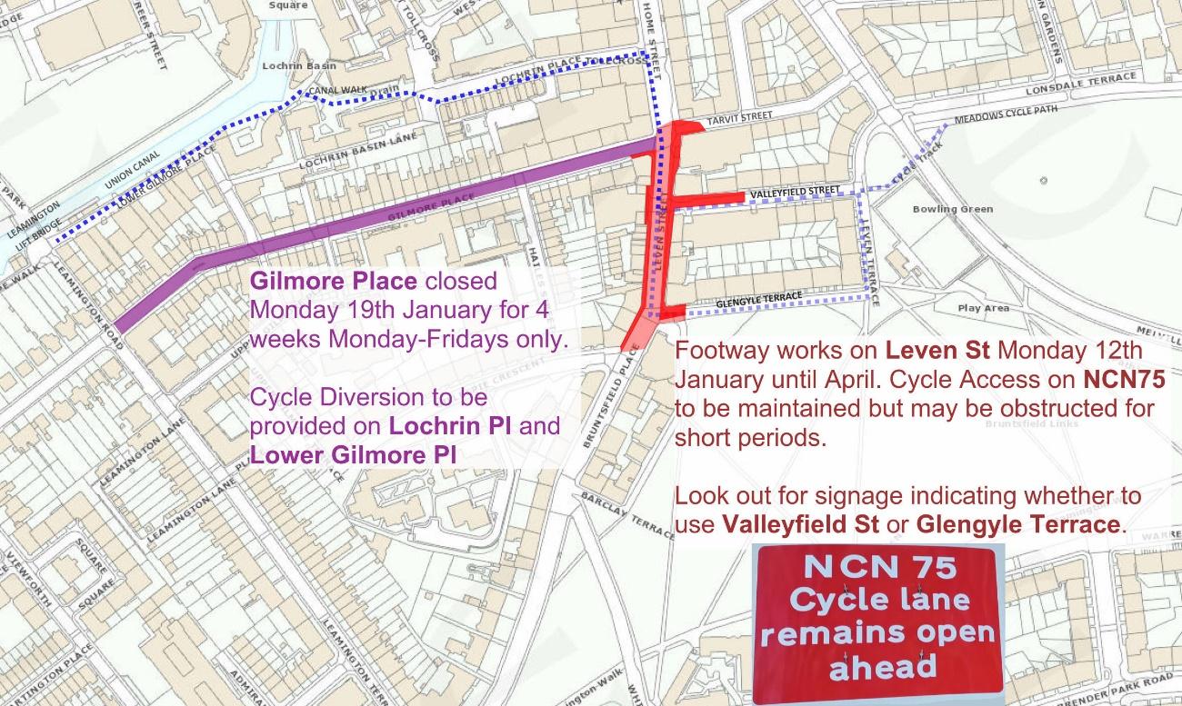 🚲 Valleyfield Street: Closed for Meadows to Union Canal Improvement works until April 2026. A cycle diversion is to be provided, which will be lengthened during the nearby Gilmore Pl resurfacing works.